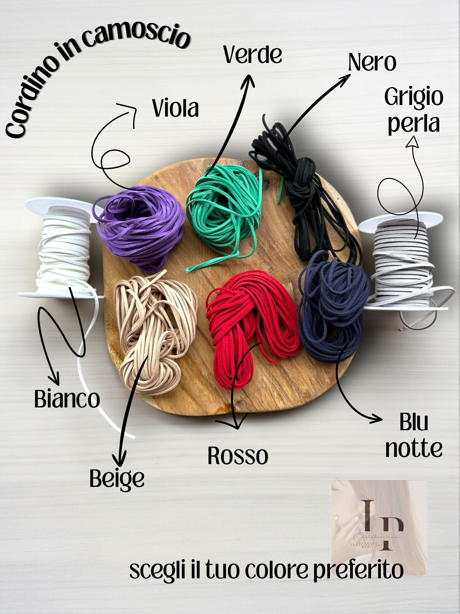 Il cordino in camoscio elasticizzato misura 120 cm con l'estremità chiusa con delle perle colorate in base alla scelta del colore del choker. Non rilasciano colore sulla pelle, morbido al tatto e indossato.