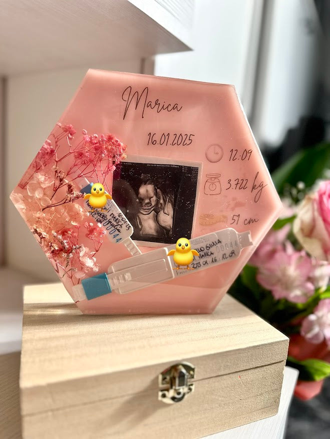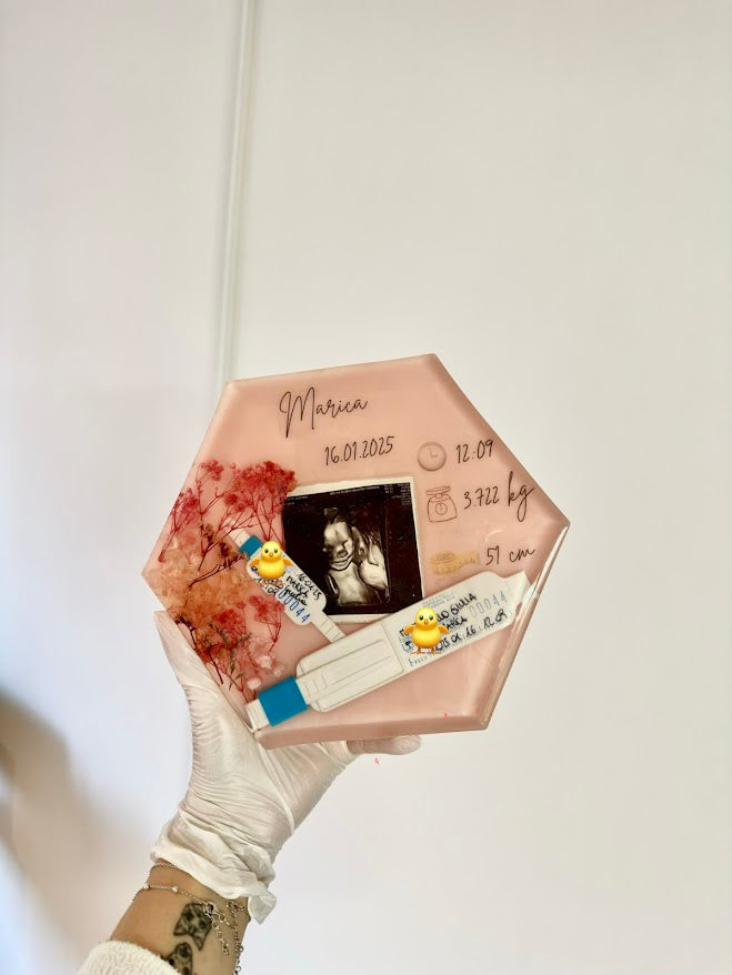 Creazione artigianale in resina realizzata su misura, che custodisce i ricordi più emozionanti: fiori essiccati, foto dell’ecografia, dati di nascita e dettagli personalizzati incisi con cura.