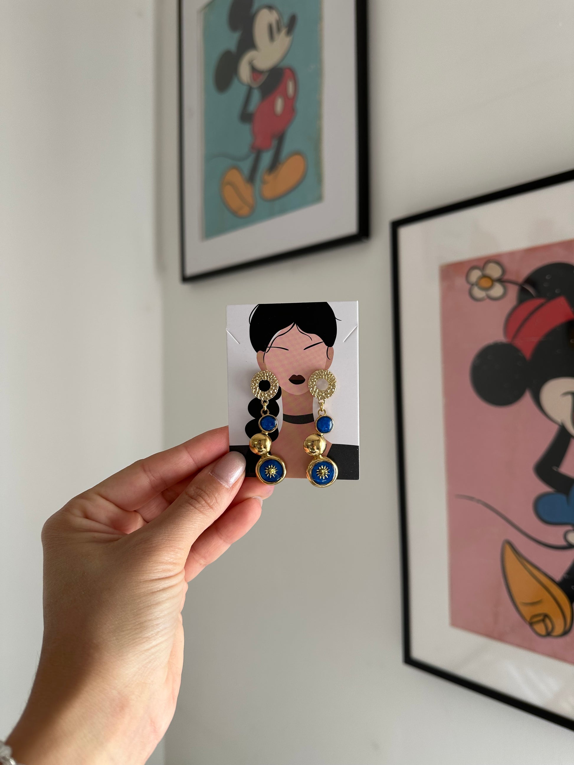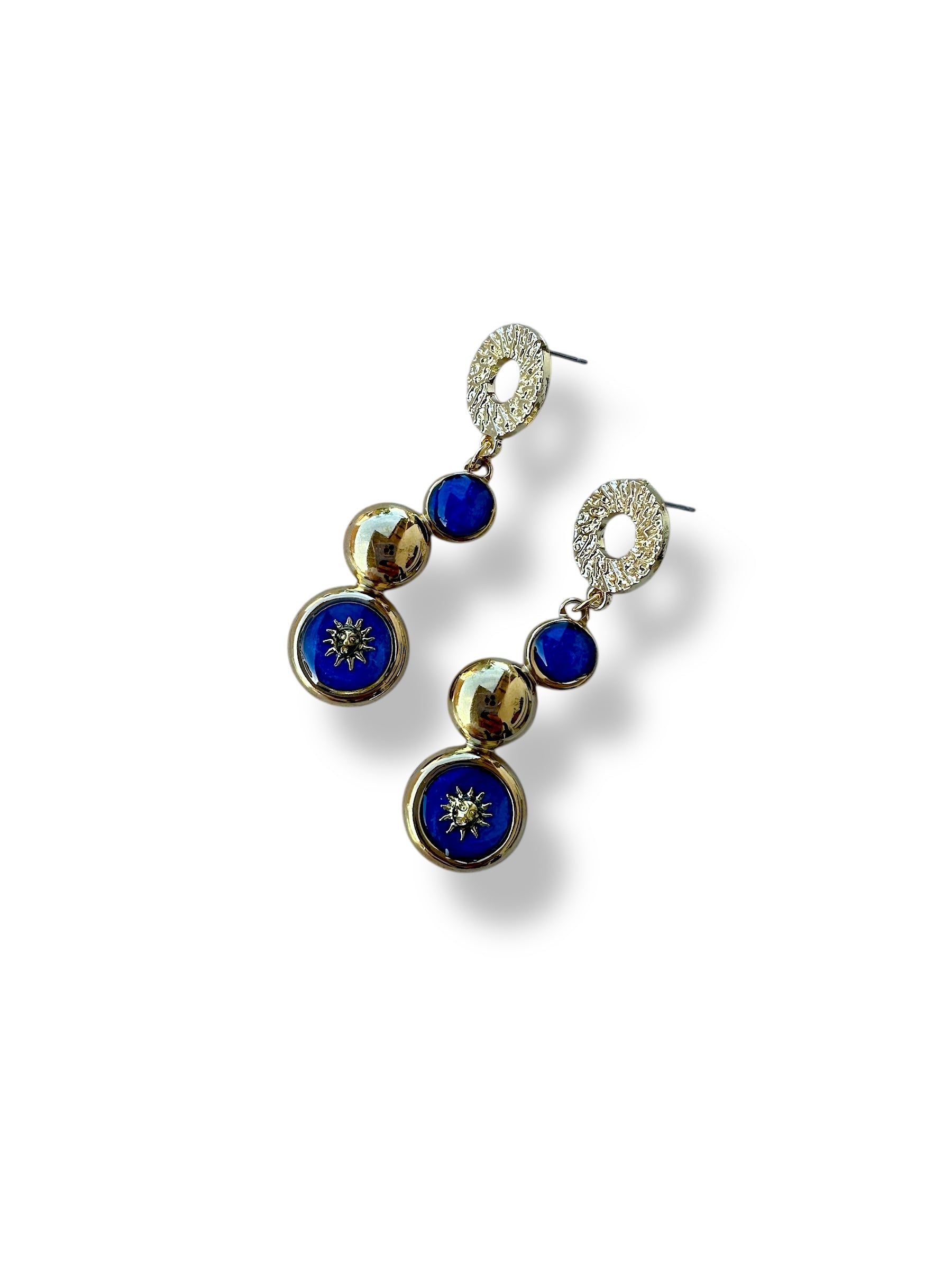✨ Orecchini in acciaio dorato con dettagli in resina blu e piccoli soli luminosi ✨