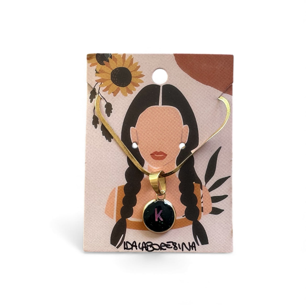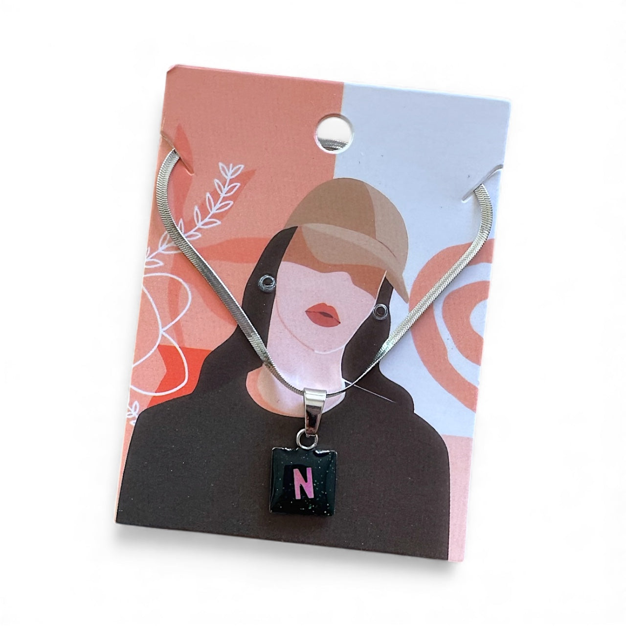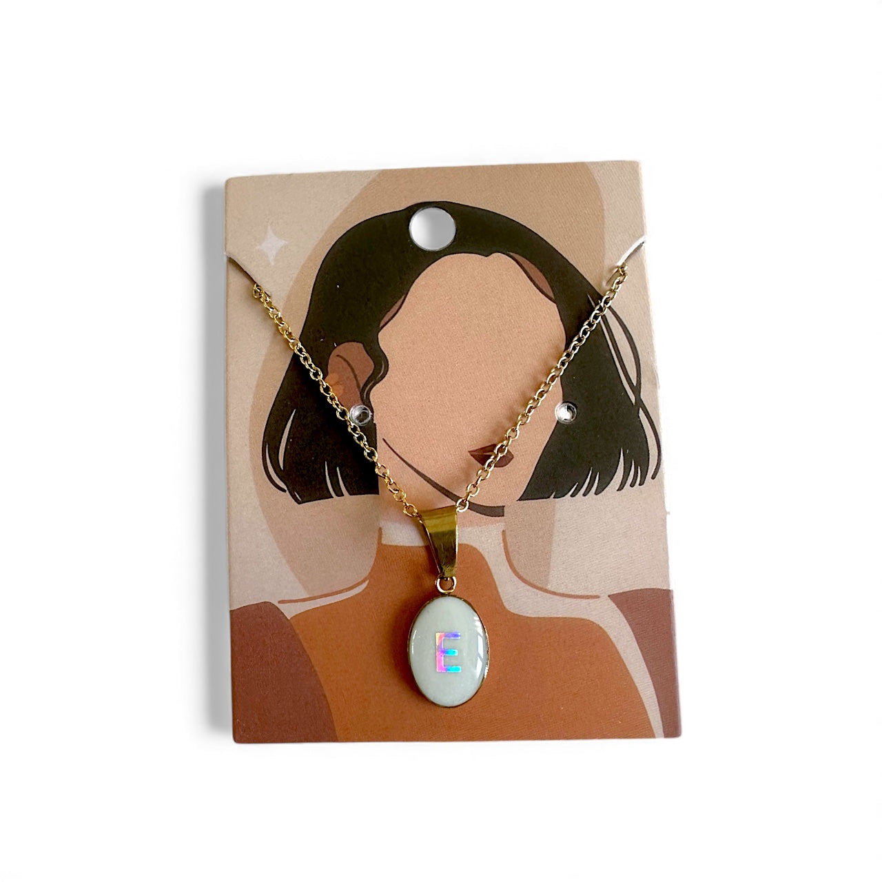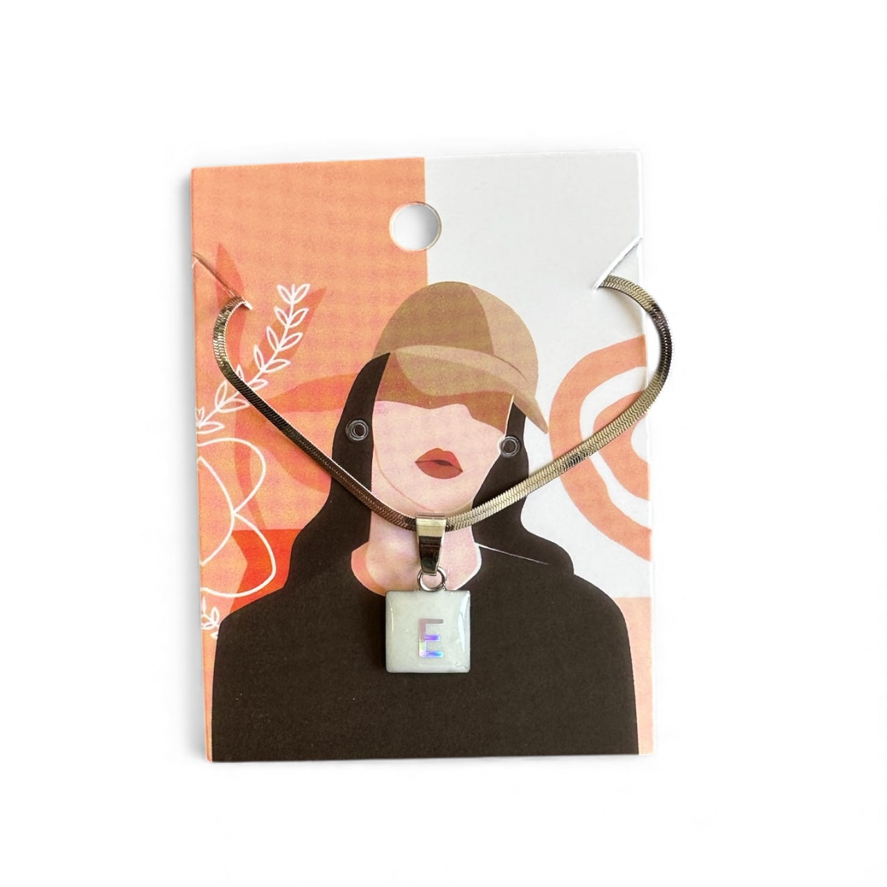 Ciondoli e collane in acciaio inossidabile con resina colorata e piccoli iniziali.