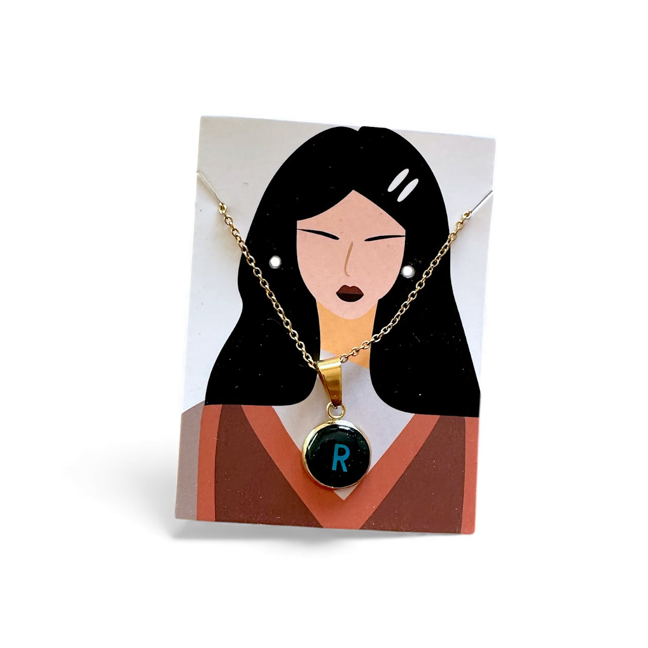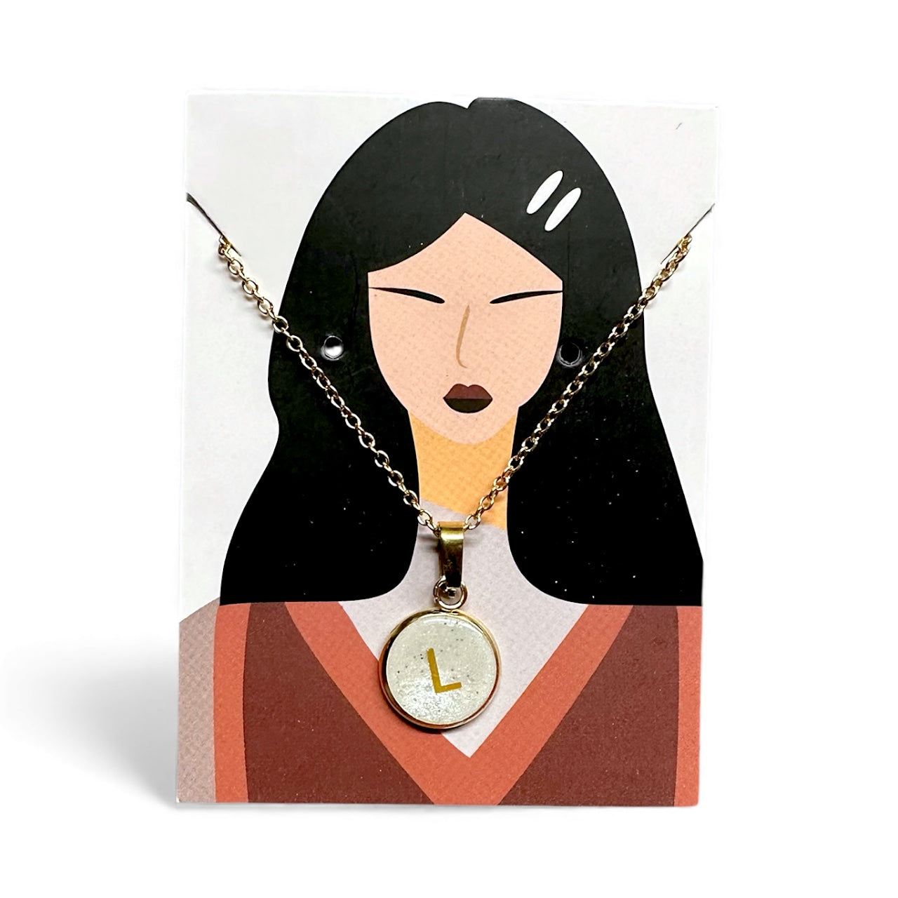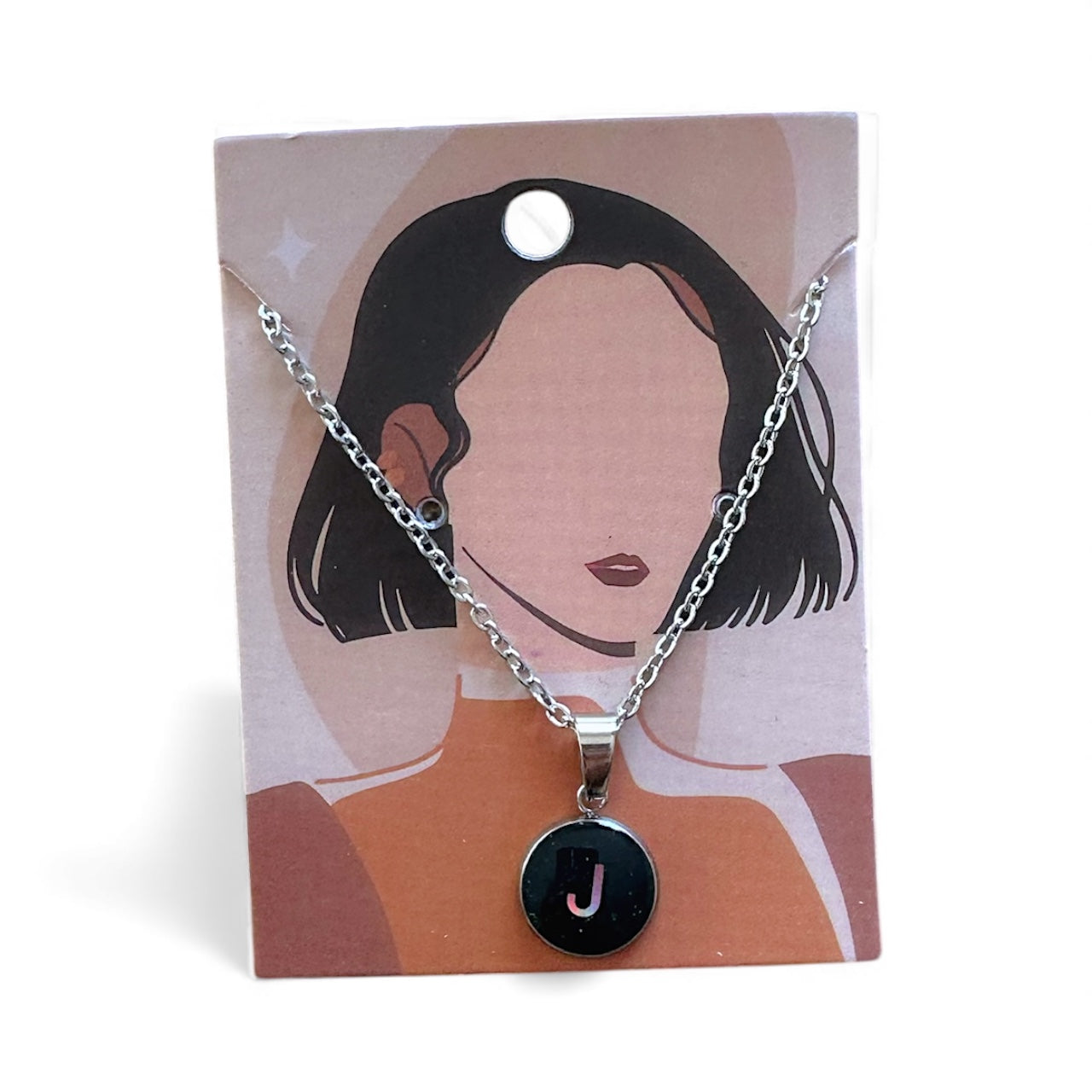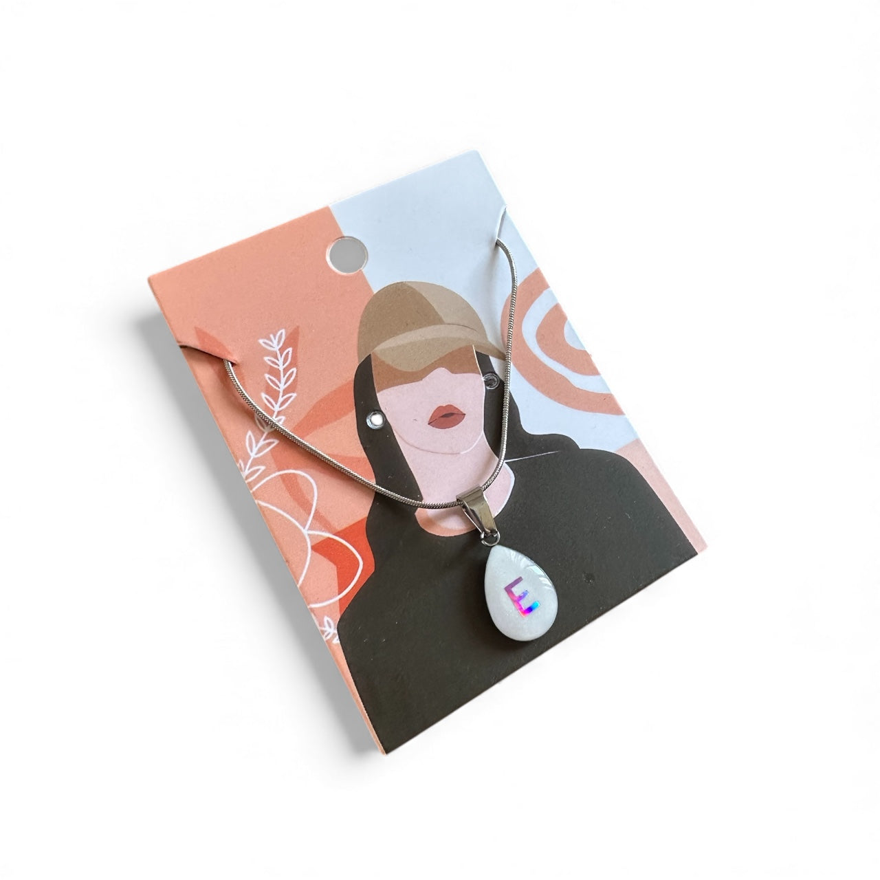 Ciondoli e collane in acciaio inossidabile con resina colorata e piccoli iniziali.