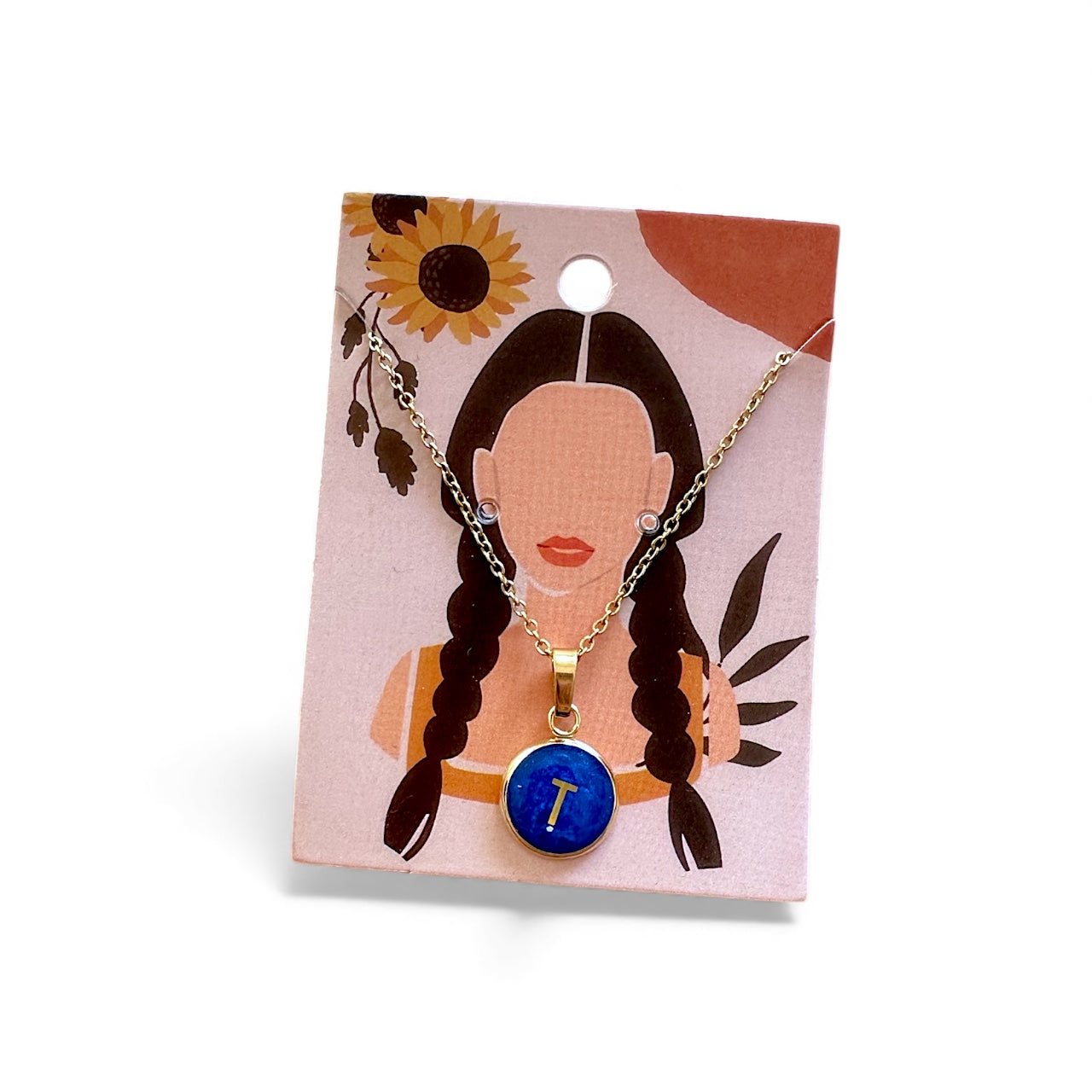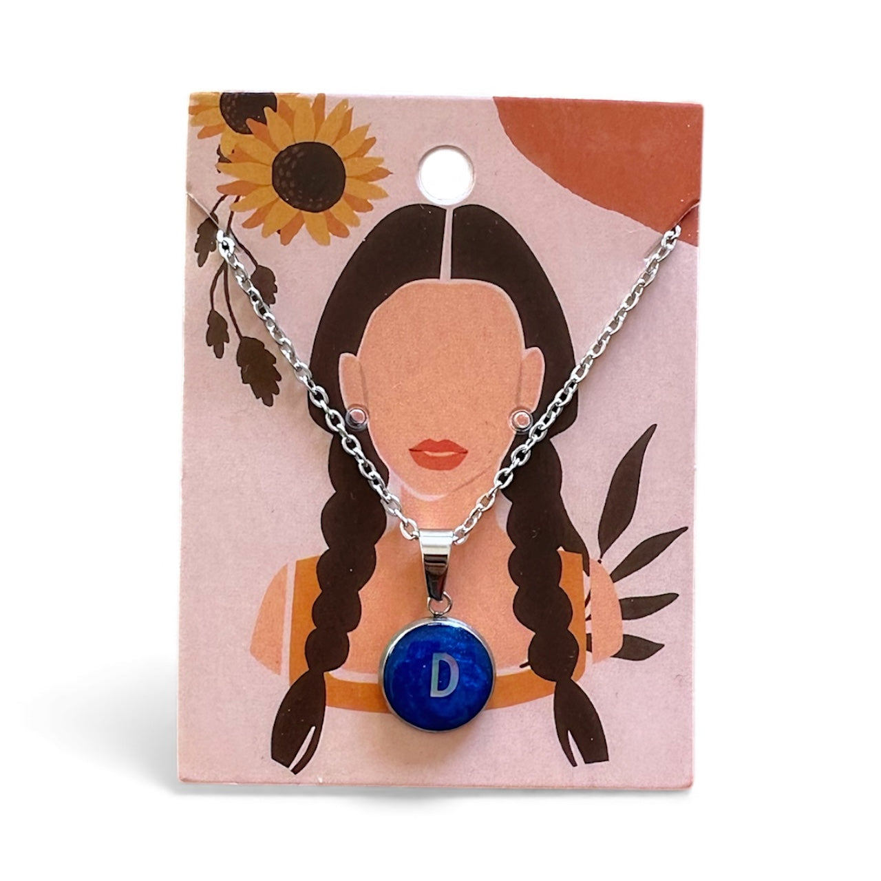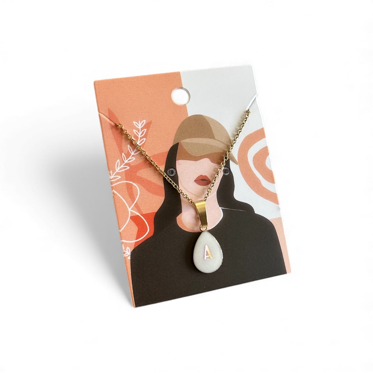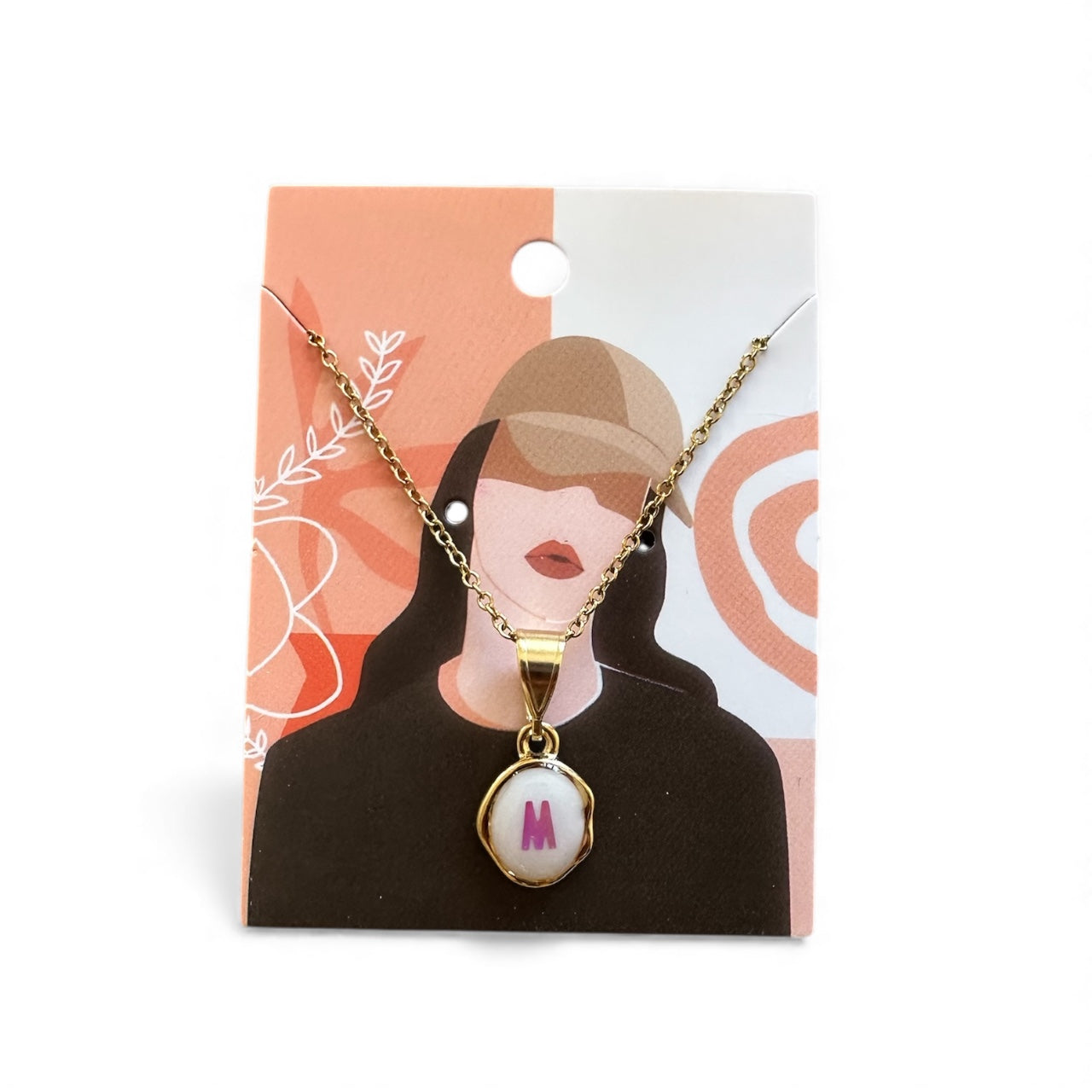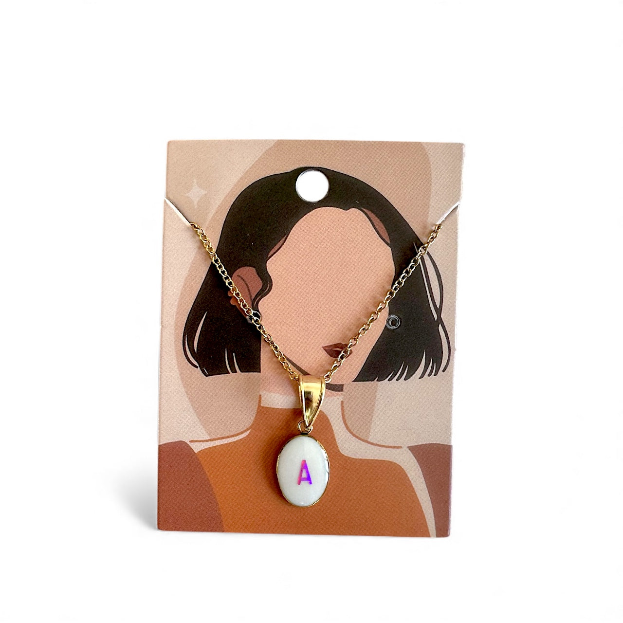 Ciondoli e collane in acciaio inossidabile con resina colorata e piccoli iniziali.