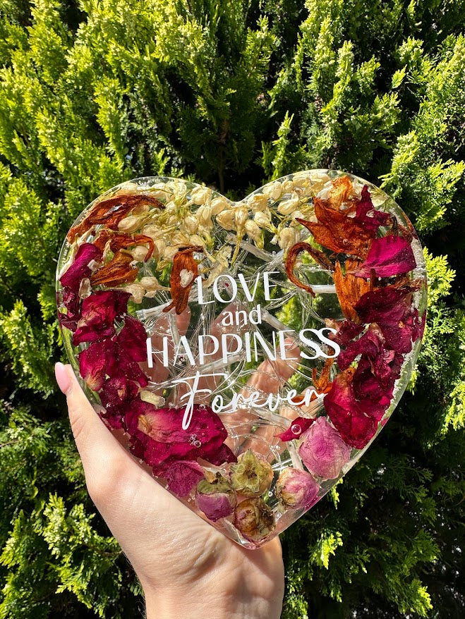 Il bouquet in resina che realizzerò con i tuoi fiori misurerà includerà tutto: dalla pressatura e l'essicazione dei fiori, alla colata in resina, alla lucidatura finale, pronta da esporre o conservare.